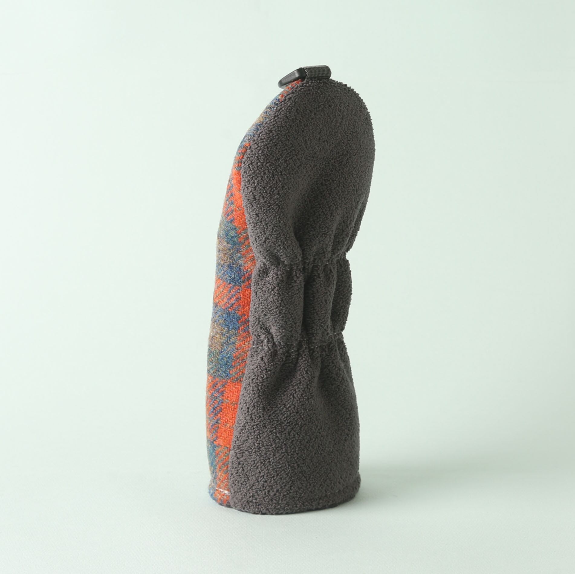 ハリスツイードは、スコットランドのアウター・ヘブリディーズ諸島で手織りされる高品質なツイード生地で、100%ピュアウールで作られており、そのウールも地元の羊から採取されたものが使用されます。ハリスツイードは、伝統的な技術と手作業によって作られるため、耐久性が高く、独特の風合いや温かみが特徴で、「ハリスツイード協会(Harris Tweed Authority)」によって厳格に管理されており、正規の製品には「オーブのマーク」と呼ばれる認証ラベルが付けられています。このマークは、製品が正式なハリスツイードであることを証明するものです。 ハリスツイードを使用したユーティリティ用ヘッドカバーは、裁断にもこだわり、柄を合わせながら贅沢に使用しています。裏地には毛並みの短いニット生地を使用。デザイン性と使用感を考慮し、表地と裏地で異なる素材を組み合わせています。中地にはボリュームと弾力、柔らかな肌触りが特徴のシープボアフリースを使用しています。