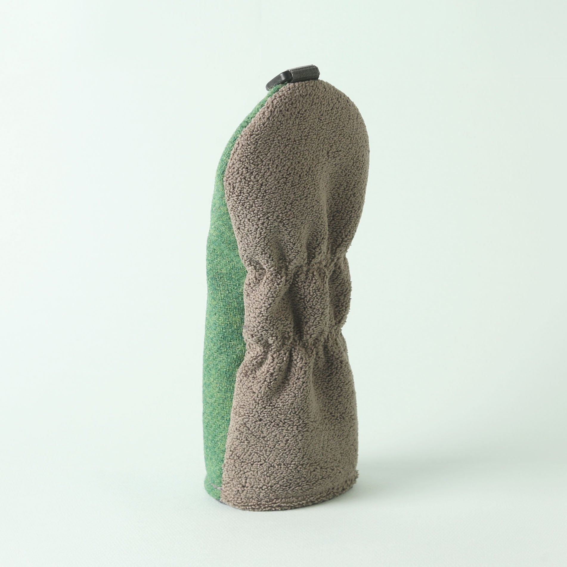 ハリスツイードは、スコットランドのアウター・ヘブリディーズ諸島で手織りされる高品質なツイード生地で、100%ピュアウールで作られており、そのウールも地元の羊から採取されたものが使用されます。ハリスツイードは、伝統的な技術と手作業によって作られるため、耐久性が高く、独特の風合いや温かみが特徴で、「ハリスツイード協会(Harris Tweed Authority)」によって厳格に管理されており、正規の製品には「オーブのマーク」と呼ばれる認証ラベルが付けられています。このマークは、製品が正式なハリスツイードであることを証明するものです。 ハリスツイードを使用したユーティリティ用ヘッドカバーは、裁断にもこだわり、柄を合わせながら贅沢に使用しています。裏地には毛並みの短いニット生地を使用。デザイン性と使用感を考慮し、表地と裏地で異なる素材を組み合わせています。中地にはボリュームと弾力、柔らかな肌触りが特徴のシープボアフリースを使用しています。