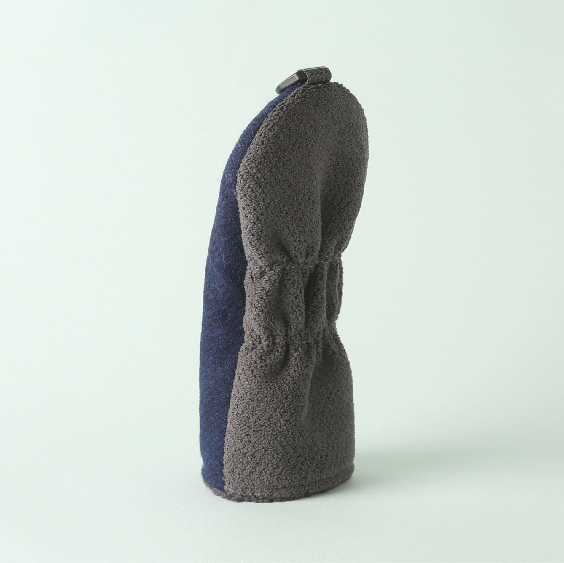ハリスツイードは、スコットランドのアウター・ヘブリディーズ諸島で手織りされる高品質なツイード生地で、100%ピュアウールで作られており、そのウールも地元の羊から採取されたものが使用されます。ハリスツイードは、伝統的な技術と手作業によって作られるため、耐久性が高く、独特の風合いや温かみが特徴で、「ハリスツイード協会(Harris Tweed Authority)」によって厳格に管理されており、正規の製品には「オーブのマーク」と呼ばれる認証ラベルが付けられています。このマークは、製品が正式なハリスツイードであることを証明するものです。 ハリスツイードを使用したユーティリティ用ヘッドカバーは、裁断にもこだわり、柄を合わせながら贅沢に使用しています。裏地には毛並みの短いニット生地を使用。デザイン性と使用感を考慮し、表地と裏地で異なる素材を組み合わせています。中地にはボリュームと弾力、柔らかな肌触りが特徴のシープボアフリースを使用しています。